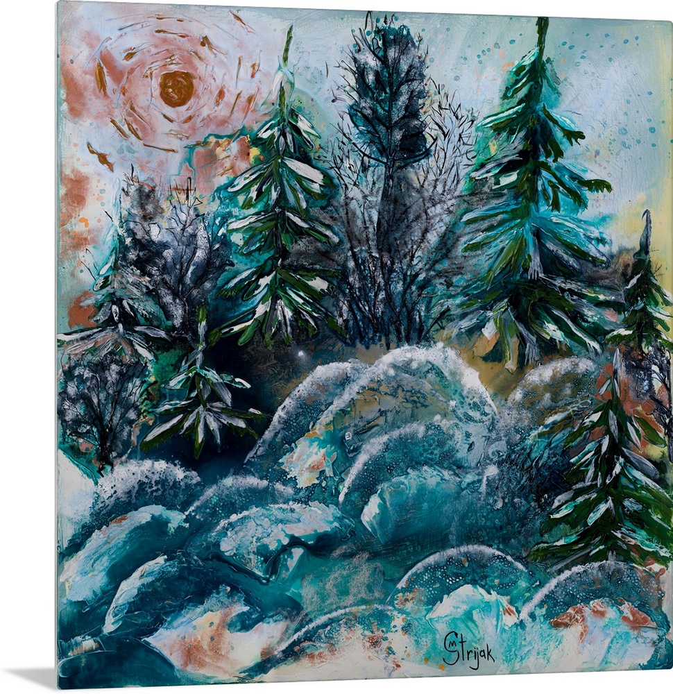 <p>Painting of the evergreen pine trees in a snow-covered forest, gleaming in the sunlight with emerald colors.</p>