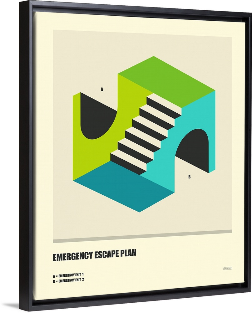 <p>Minimalist illustration of an emergency escape plan in blue, green, black, and cream hues; labeling two emergency exits.</p>