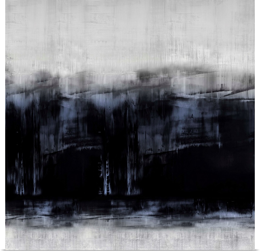 <p>Abstract artwork of vertical brush strokes in black, blue and white with visible horizontal lines throughout.</p>