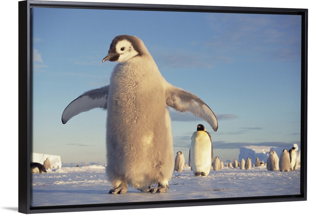 <p>Emperor Penguin (Aptenodytes forsteri) large chick on fast ice, midnight sun in austral spring, No-name Rookery, Princess Martha Coast, Weddell Sea, Antarctica</p>