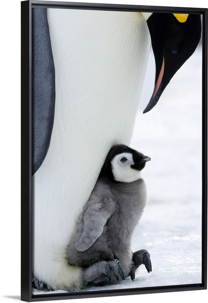 <p>Emperor penguin chick and adult (Aptenodytes forsteri), Snow Hill Island, Weddell Sea, Antarctica, Polar Regions</p>