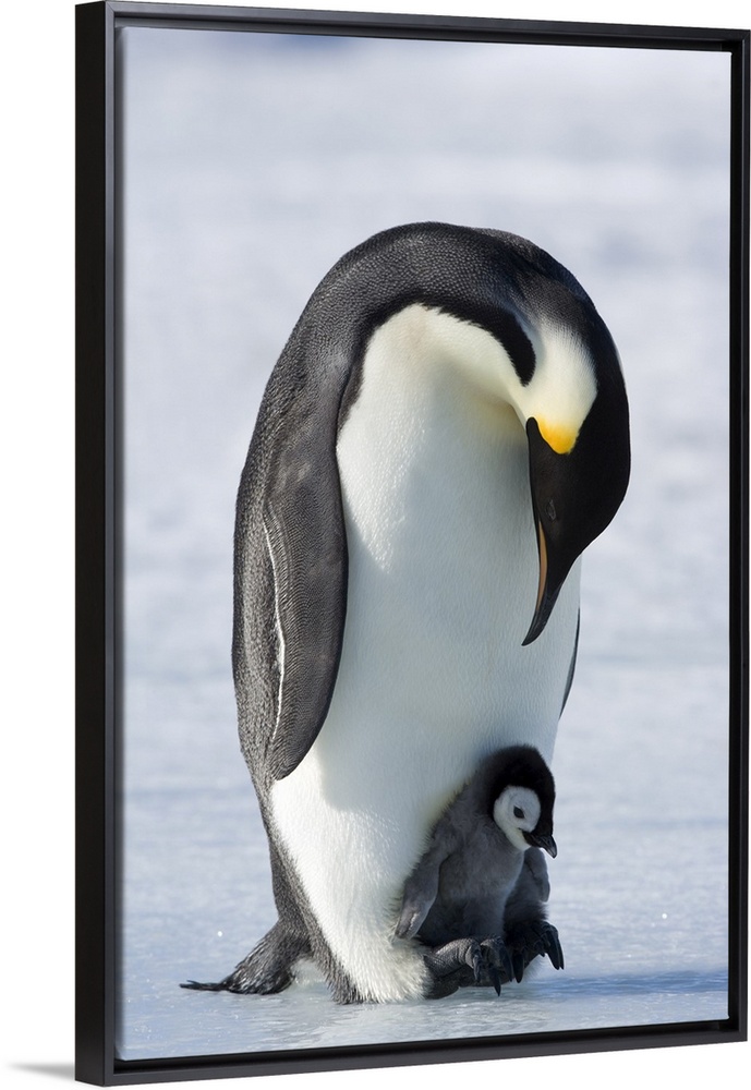 <p>Emperor penguin chick and adult (Aptenodytes forsteri), Snow Hill Island, Weddell Sea, Antarctica, Polar Regions</p>