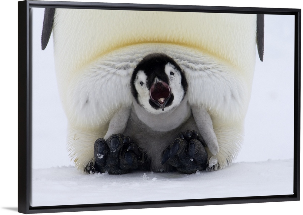 <p>Emperor Penguin (Aptenodytes forsteri) chick on the feet of an adult calling, Antarctica</p>