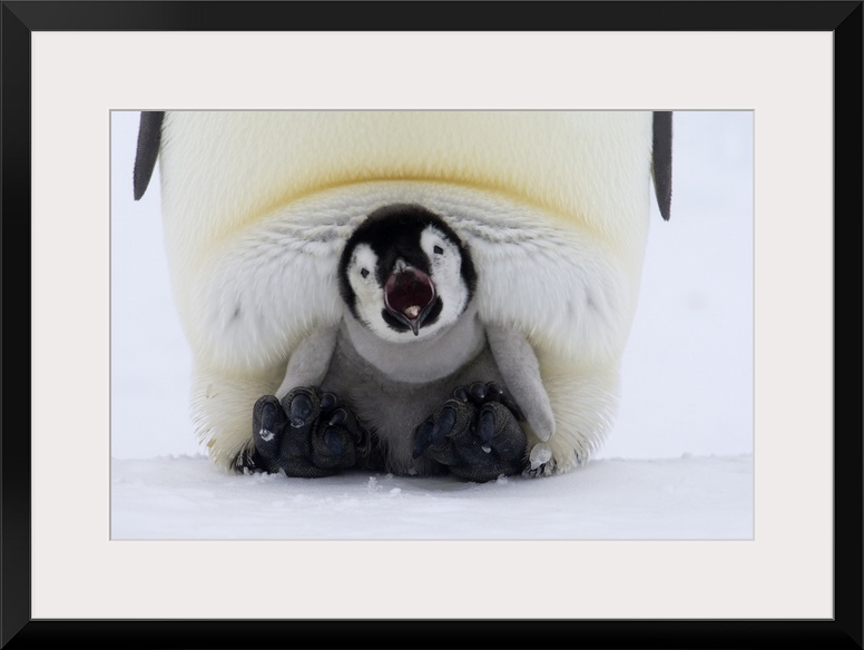 <p>Emperor Penguin (Aptenodytes forsteri) chick on the feet of an adult calling, Antarctica</p>