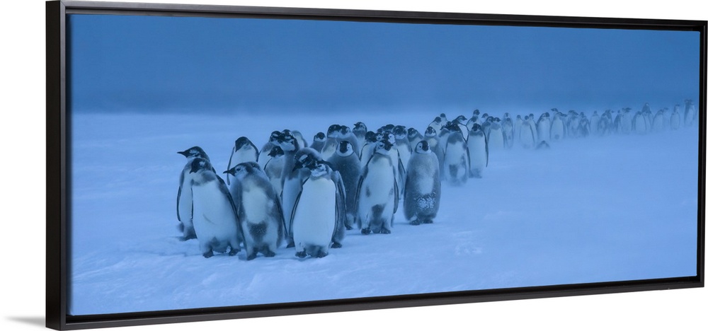 <p>Emperor Penguin Chicks (Aptenodytes forsteri) lined-up in a row, walking along the snowy landscape in a blizzard, West Ice Shelf, East Antarctica, Antarctica</p>