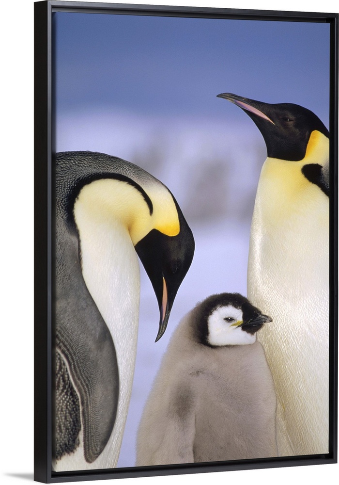 <p>Emperor Penguin (Aptenodytes forsteri) pair with chick, Atka Bay, Princess Martha Coast, Weddell Sea, Antarctica</p>