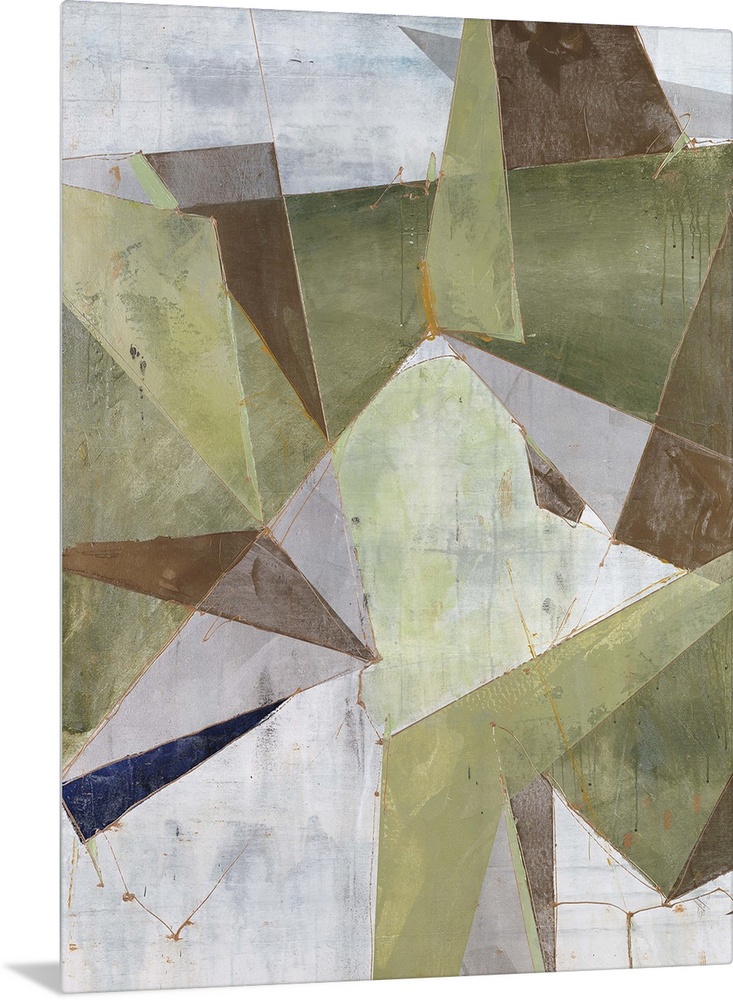 <p>Abstract painting of overlapping triangular shapes in neutral and earth tones, randomly placed and textured with lines and varying brushstrokes.</p>