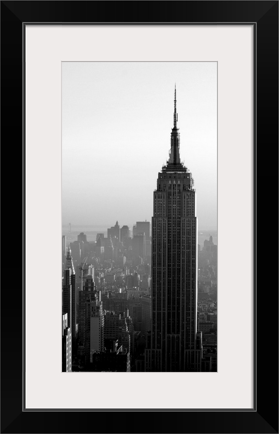 <p>A long vertical black and white image of the Empire States Building in New York City.</p>