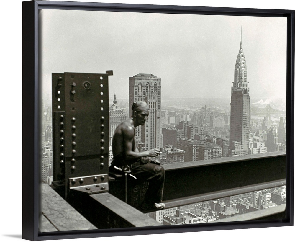 <p>Hine took to great heights for this well-known photograph of a construction worker on the Empire State Building taking a break to enjoy a cigarette. Hine's photograph juxtaposes the ordinary (a short break from work) with the extraordinary (the awe-inspiring view of the city). The recently completed Chrysler Building, whose height the Empire State Building eclipsed, appears prominently amid the haze in the middle distance as if already relegated to history.</p>