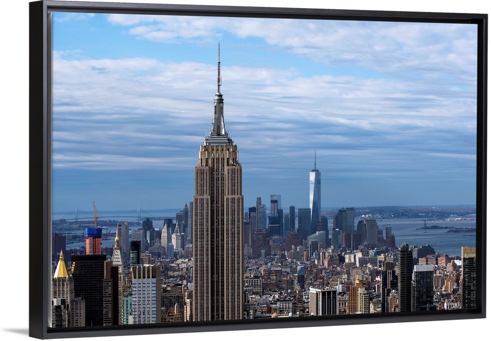 <p>The Empire State Building rising above the New York City skyscrapers, with the One World Trade Center building in the distance.</p>