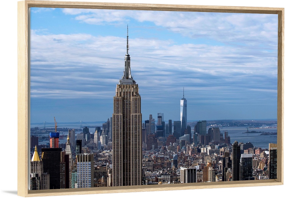 <p>The Empire State Building rising above the New York City skyscrapers, with the One World Trade Center building in the distance.</p>
