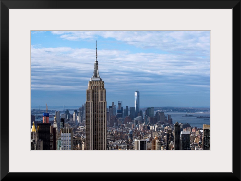 <p>The Empire State Building rising above the New York City skyscrapers, with the One World Trade Center building in the distance.</p>