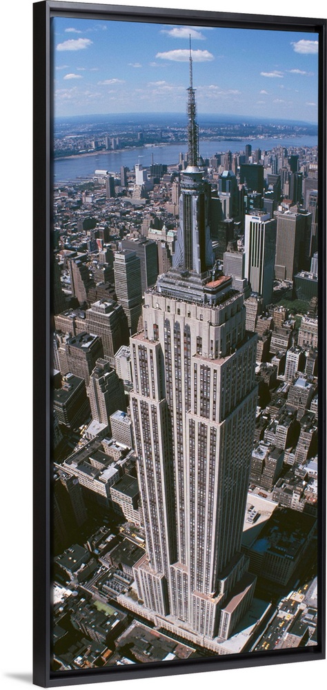 <p>Panoramic photograph taken from an aerial view focuses on a landmark skyscraper found within Manhattan as it overlooks the other various buildings and rivers surrounding the giant structure.</p>