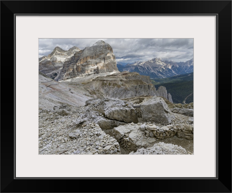 <p>Emplacements of the Austrian forces during world war 1 at Mount Lagazuoi in the Dolomites, now preserved as a museum. The peaks of the Tofane in the background. The dolomites are listed as UNESCO world heritage. Europe, central Europe, Italy.</p>