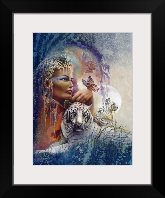 <p>A contemporary painting of a woman wearing a golden headdress with dangling beads from the sides with white tigers lounging in the foreground of the image.</p>