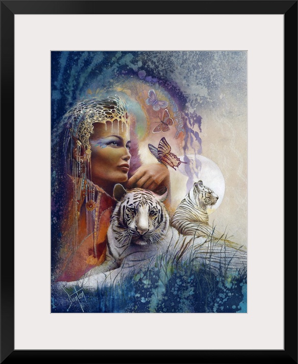 <p>A contemporary painting of a woman wearing a golden headdress with dangling beads from the sides with white tigers lounging in the foreground of the image.</p>