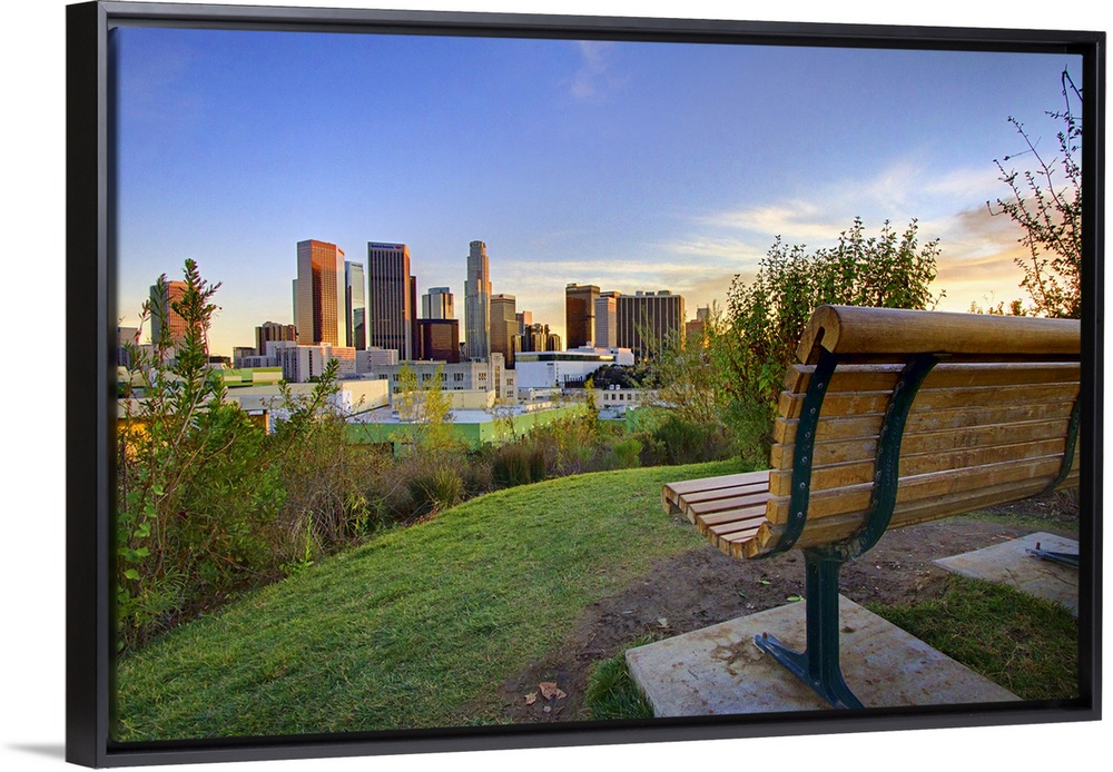 <p>Photograph of park bench overlooking city skyline at dusk.</p>