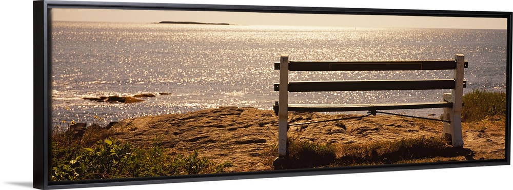 <p>Panoramic photo on canvas of an empty bench overlooking a beach in the northeast US.</p>