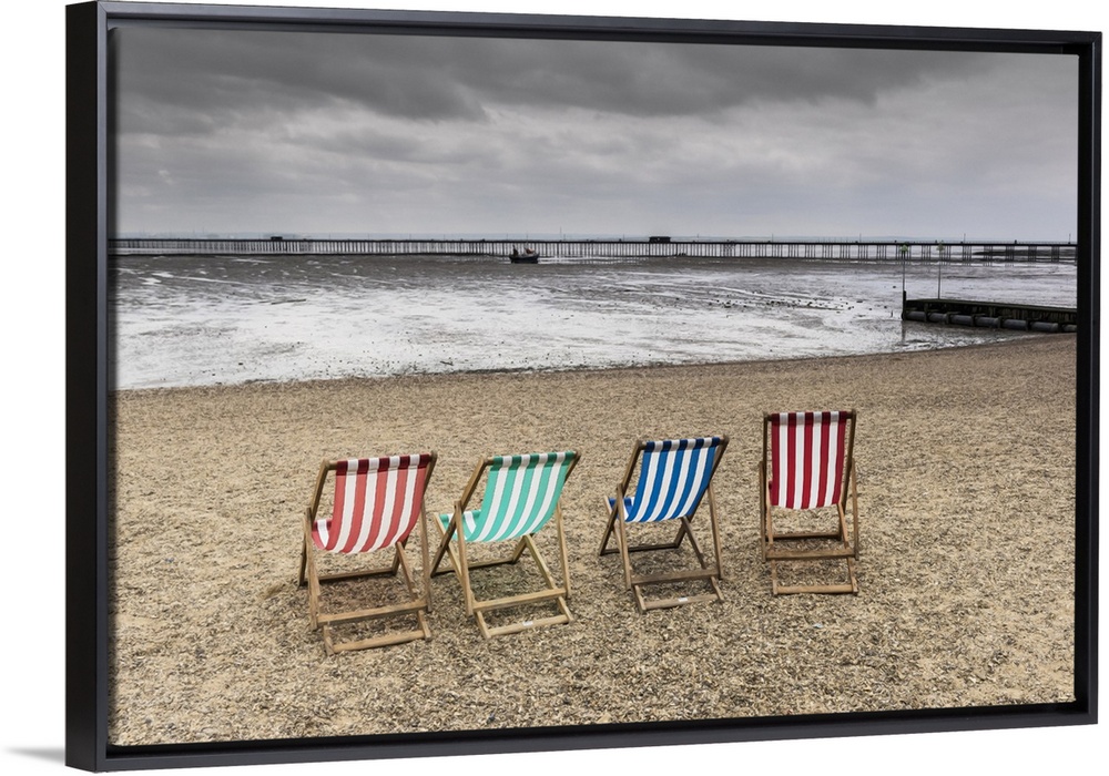 <p>Empty deckchairs on Jubilee Beach in Southend on a cloudy day.</p>