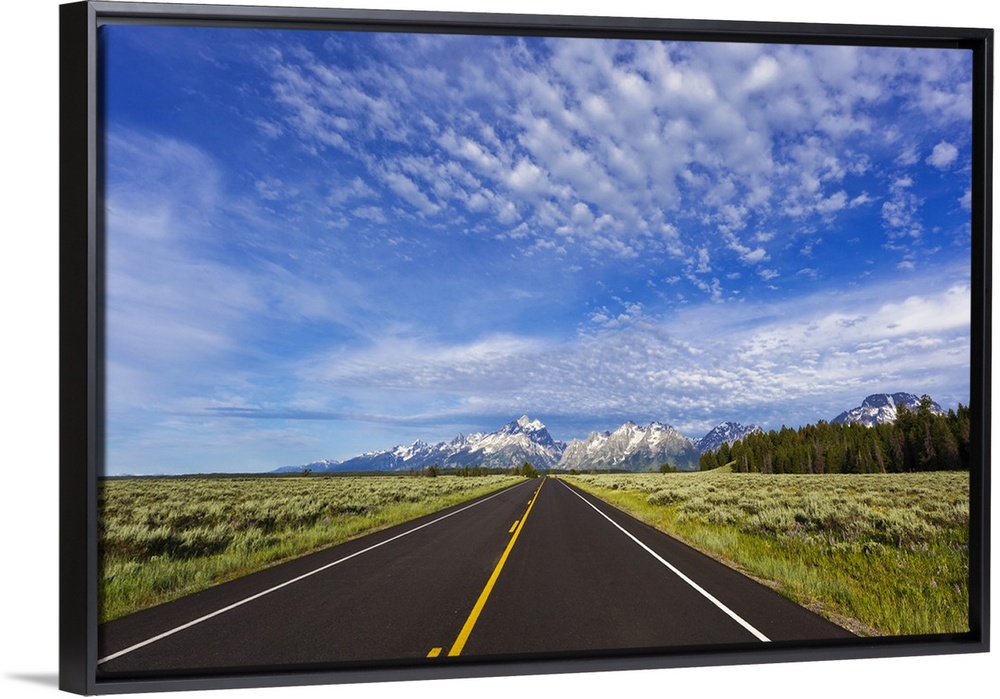 <p>Empty park road in Grand Teton National Park, Wyoming, USA.</p>