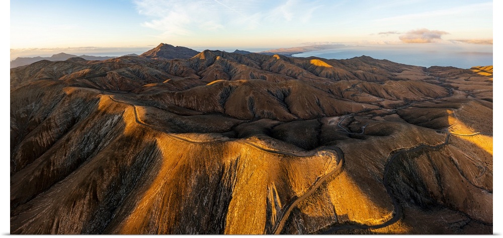 <p>Empty road crossing the barren mountains of Pajara at dawn from Sicasumbre observatory, Fuerteventura, Canary Islands, Spain, Atlantic, Europe</p>