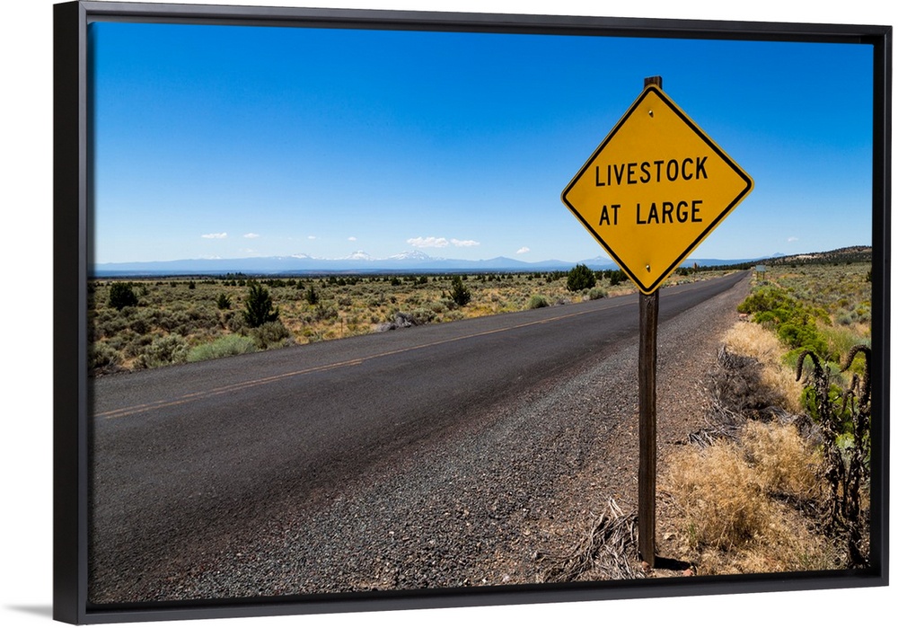 <p>Empty road in central Oregon's High Desert with Livestock at Large sign and the Three Sisters peaks in the distance, Oregon</p>