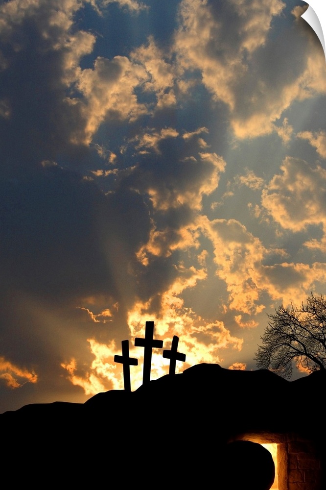 <p>Dramatic image of three crosses on a hill against beams of sunlight, with an open tomb.</p>