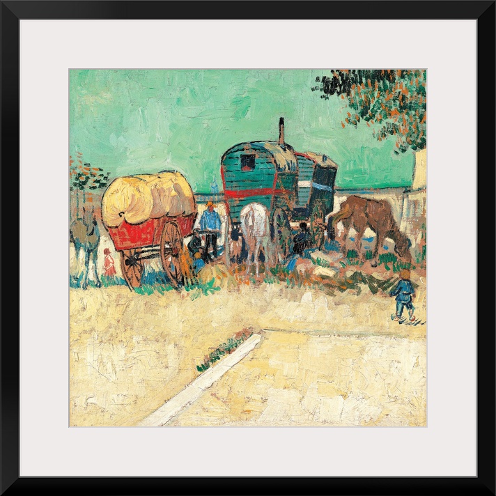 <p>Encampment of Gypsies with Caravans, by Vincent Van Gogh, 1888, 19th Century, oil on canvas, cm 45 x 51 - France, Ile de France, Paris, Muse dOrsay, RF3670. All. Encampment of gypsies with caravans animals horse courtyard yellow green wheel child. (251261</p>