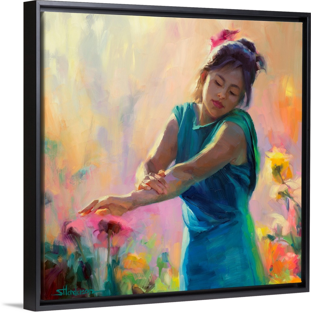 <p>Traditional impressionist painting an an Hispanic woman in a teal dress standing in a country garden of wildflowers, arms out to the sun.</p>
