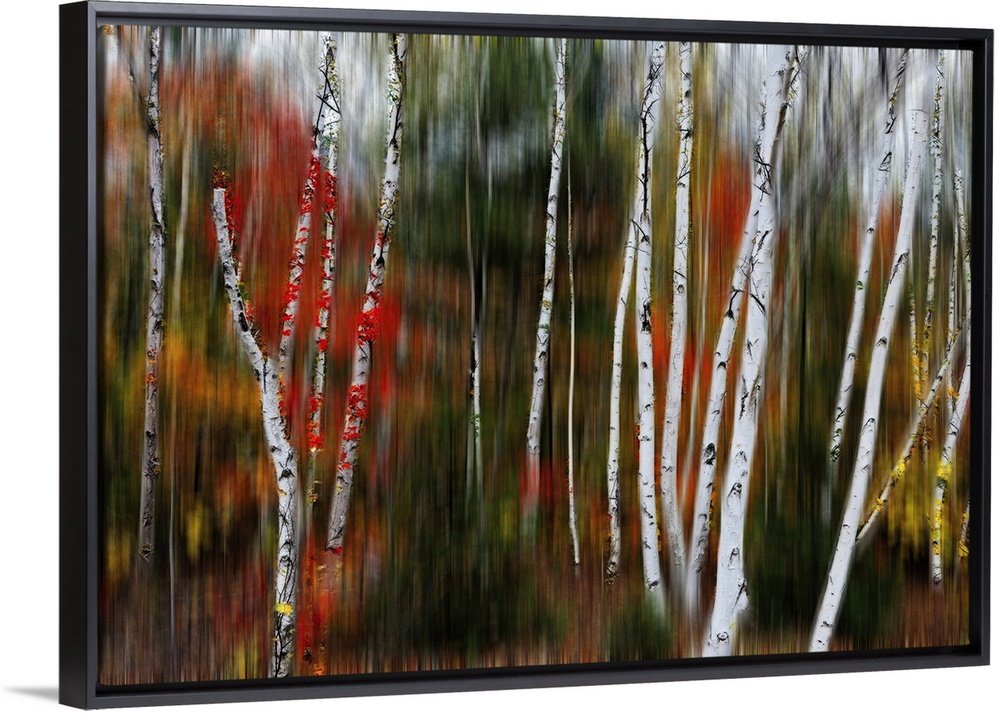 <p>Nature abstract with birch trees in blurry forest, Acadia national park, Maine.</p>