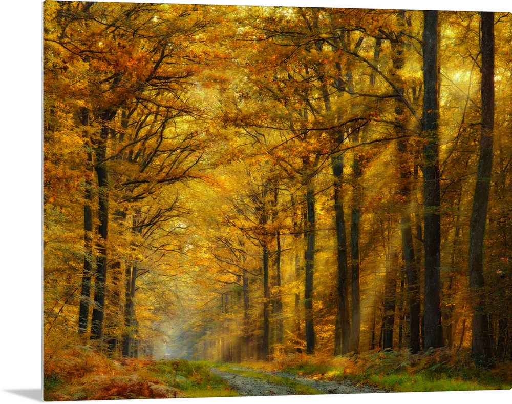 <p>Golden sunlight shining in a forest in the fall.</p>