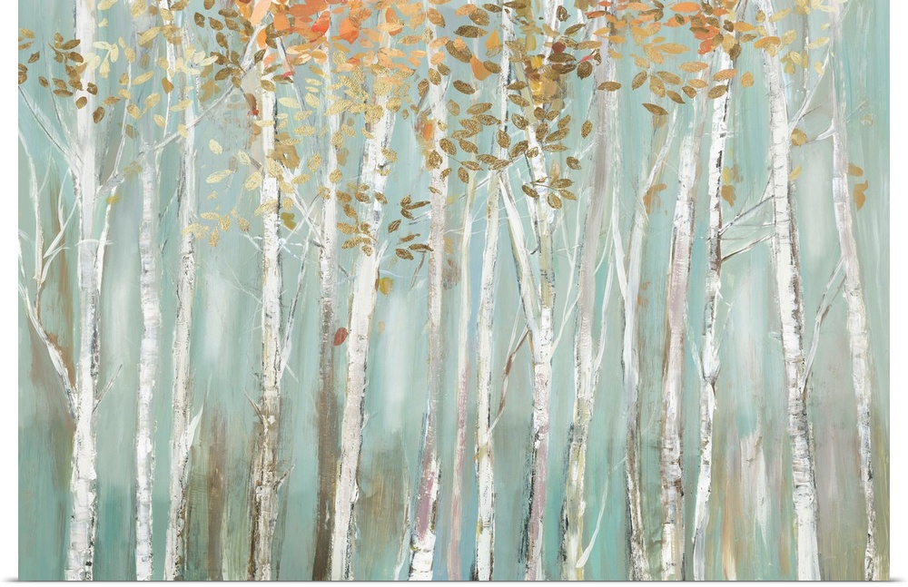 <p>Contemporary horizontal painting of a forest of birch trees with warm colored leaves.</p>
