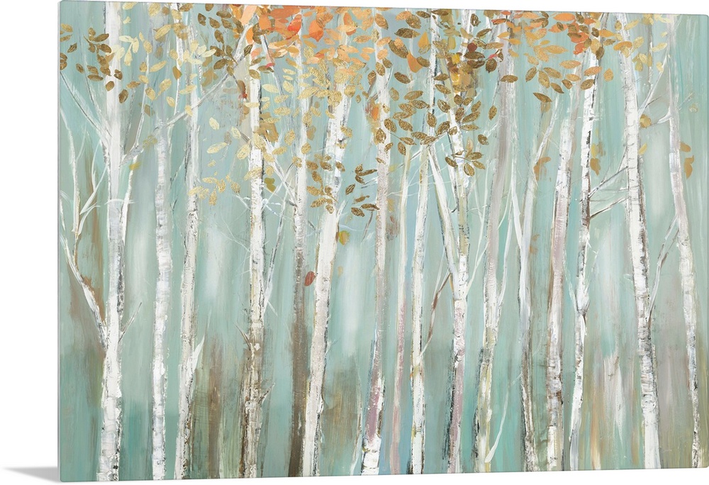 <p>Contemporary horizontal painting of a forest of birch trees with warm colored leaves.</p>