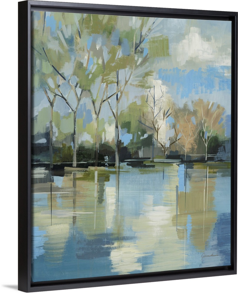 <p>A serene contemporary painting of trees behind a lake painted in a blocky abstract style</p>