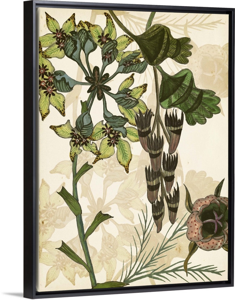 <p>Contemporary artwork of garden flowers in muted shades against a beige floral background.</p>