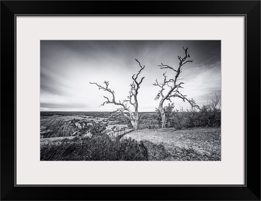 <p>Skeletal remains of live oak trees overlook the Hill Country surrounding Texas' Enchanted Rock. The massive stone towers above the landscape, and has captured the imagination for thousands of years. More than 400 archeological sites have been discovered on the 1,600-acre state park, with 120 designated as State Archeological Landmarks.</p>