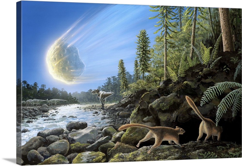 <p>Illustration of the K/T Event at the end of the Cretaceous Period. A ten-kilometre-wide asteroid/comet is entering the Earth's atmosphere and a pair of mammals related to Purgatorius are diving to safety. A T. rex and a herd of hadrosaurs (Edmontosaurus) are exposed to the unfolding terrible event.</p>