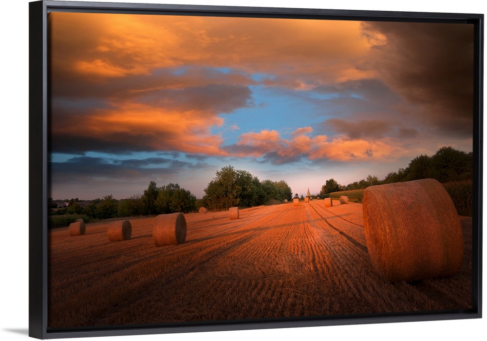 <p>Sunset over bales of hay</p>