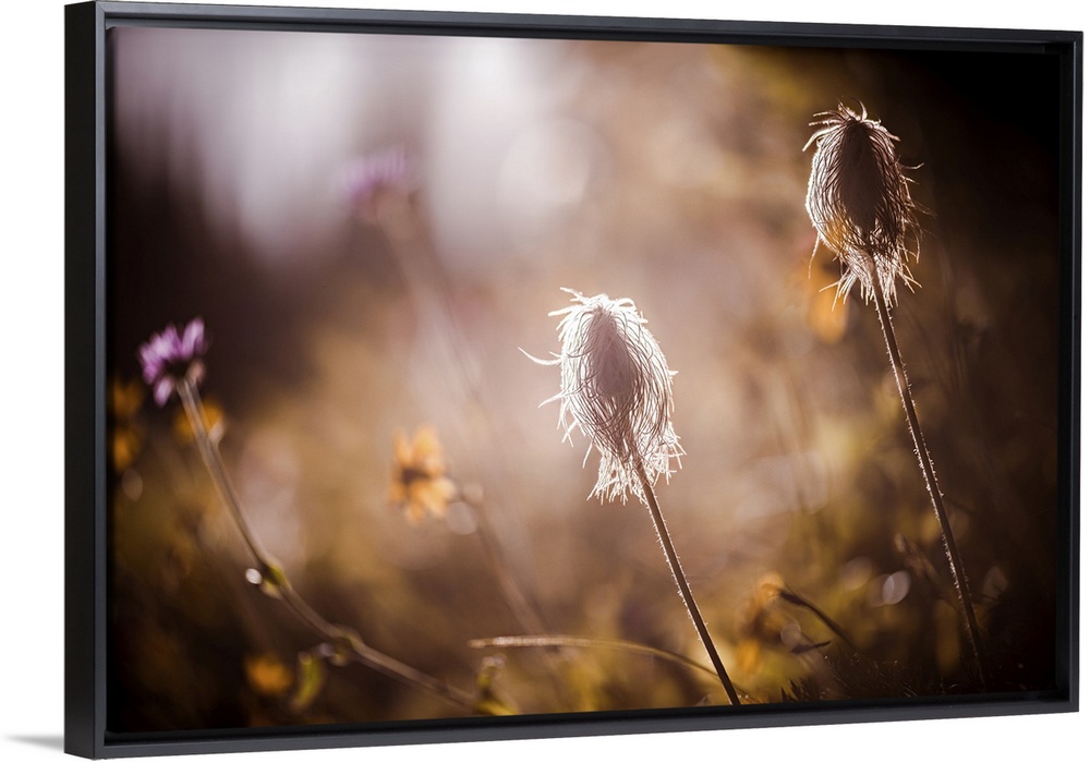 <p>An image of two seedheads of the Pasque Flower, which grow profusely in mountain meadows in British Columbia, Canada. The image was shot against the sunlight with a macro lens at F/2.8, highlighting the edges and hairs of the mopheads while keeping the surrounding scene slightly blurred. Ursula Abresch Wildflowers Collection</p>