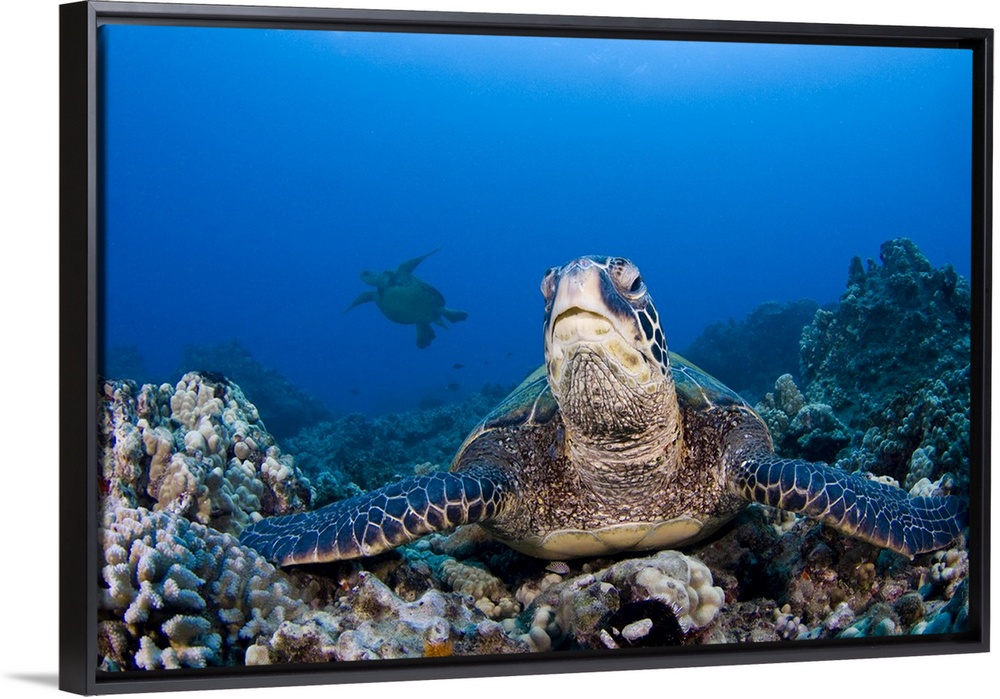 <p>Endangered green sea turtles (Chelonia mydas) swimming in the blue waters of Hawaii.</p>