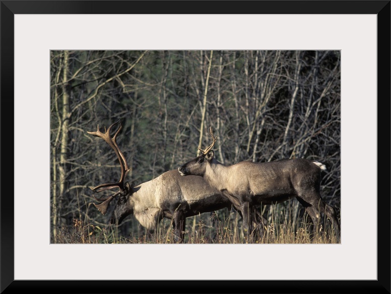 <p>Endangered woodland caribou, Rangifer tarandus, bull and a cow along a forest in the southern Yukon, Canada</p>