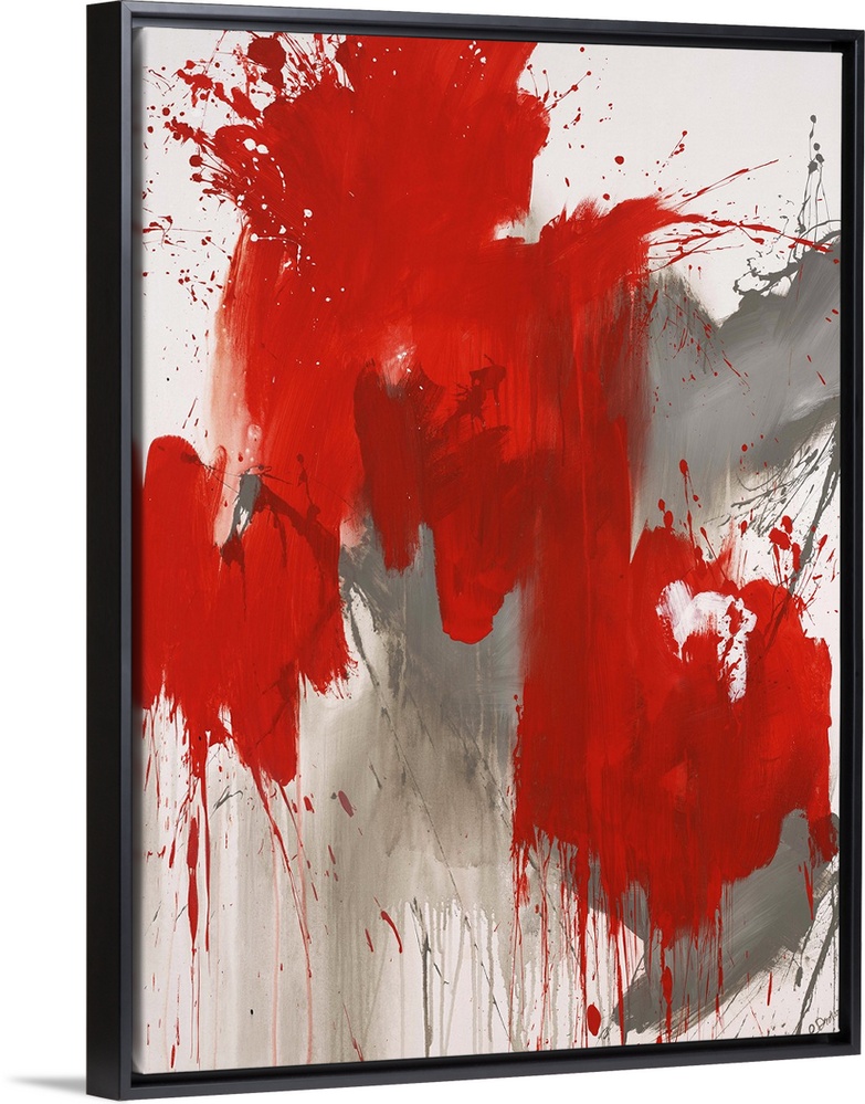 <p>Contemporary abstract painting of a giant red splash of paint smeared and splattered against a neutral background.</p>