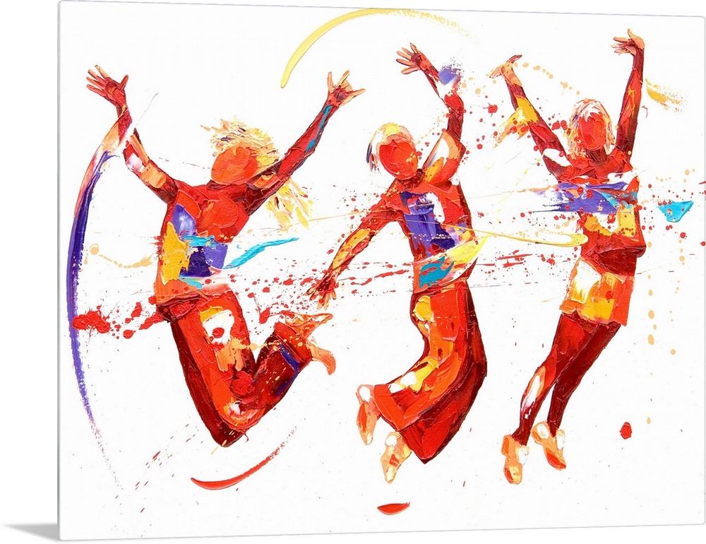 <p>Contemporary painting using deep warm tones to create three dancers leaping into the air against a white background.</p>