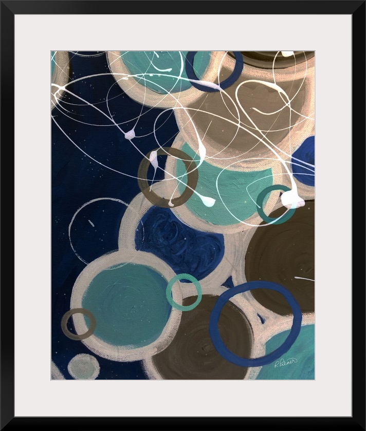 <p>A contemporary abstract painting using circle and paint drizzle in mute tones.</p>