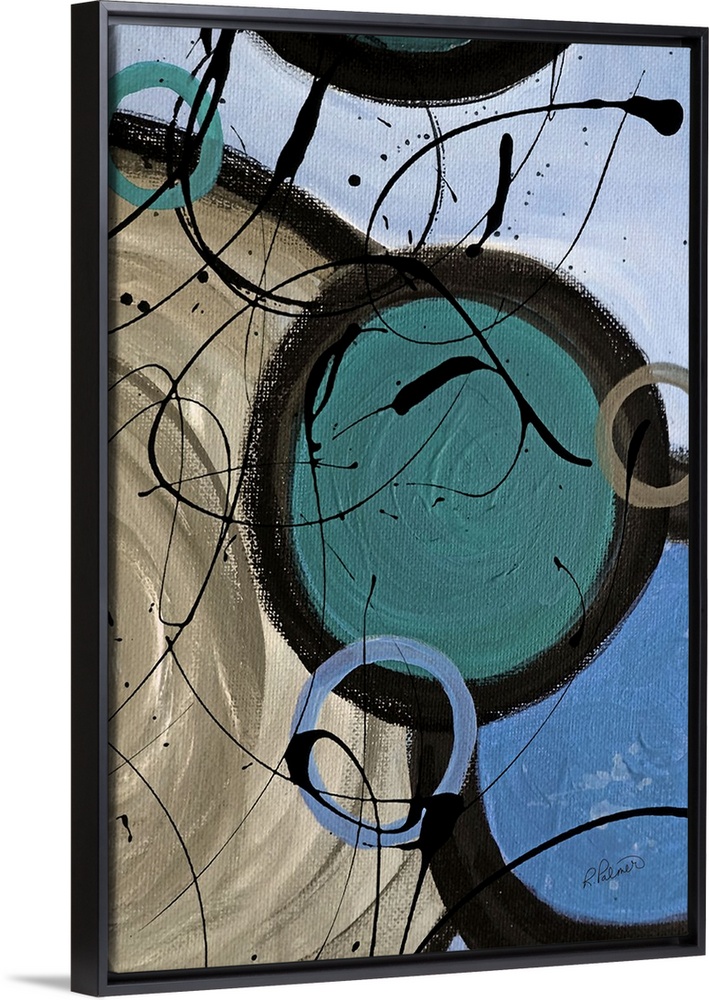<p>A contemporary abstract painting using circle and paint drizzle in mute tones.</p>