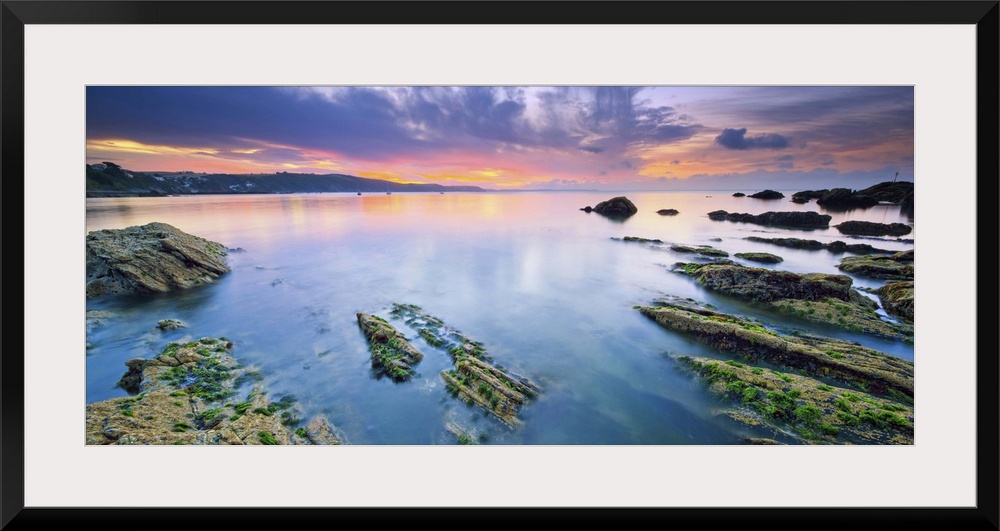 <p>United Kingdom, UK, England, Great Britain, Cornwall, Looe, Rocks emerging from the low tide seaside at dawn near Looe village</p>