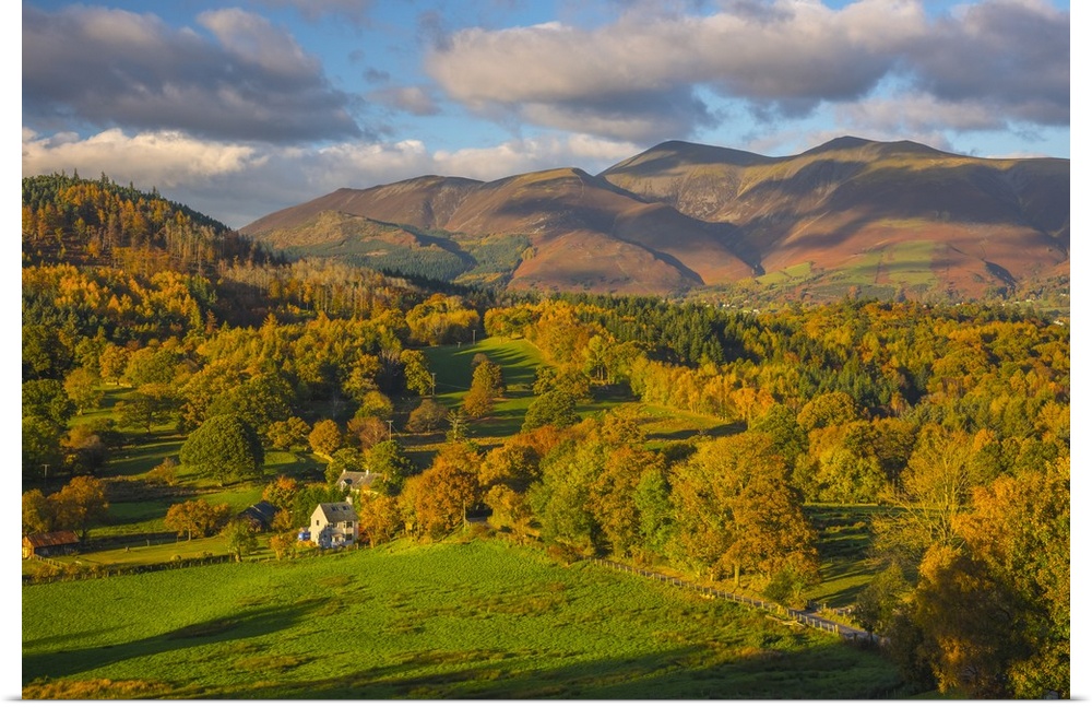 <p>UK, England, Cumbria, Lake District, Derwentwater, farm house with Skiddaw mountain above Keswick in background.</p>