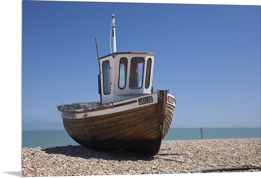 <p>England, Kent, Deal. Old wooden fishing boat on the shingle beach at Deal.</p>