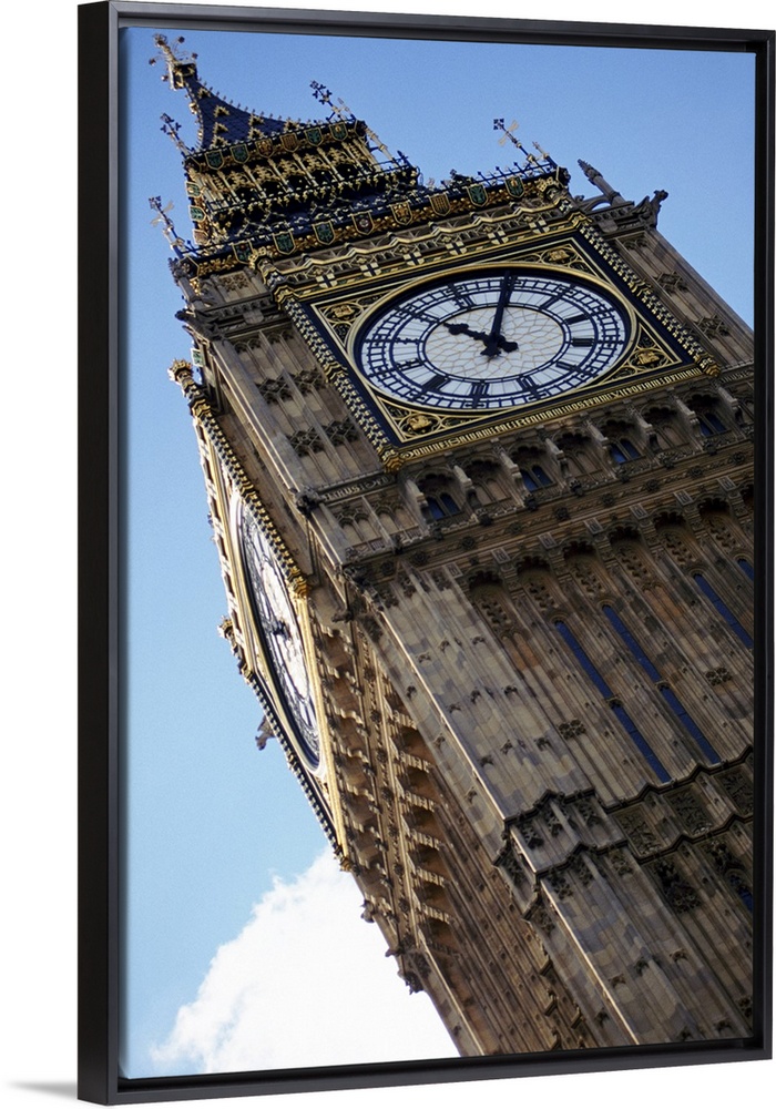 <p>Big Ben is photographed from below showing mostly the top of the structure at an angle.</p>