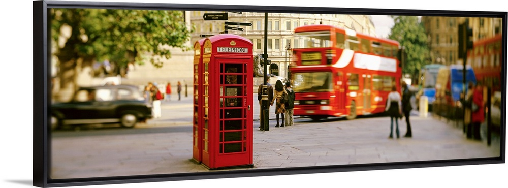 <p>Big horizontal photograph of a red telephone box in Trafalgar Square, London, surrounded by pedestrians and slightly blurred traffic in the street.</p>